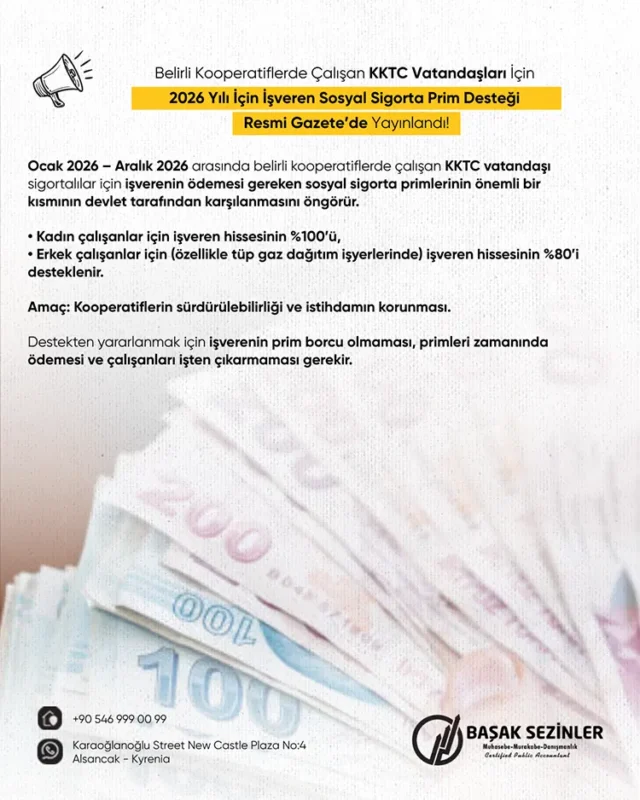 30 Oca 2026 Yılı İçin Kooperatiflerde Çalışan KKTC Vatandaşlarına İşveren Sosyal Sigorta Prim Desteği KKTC’de belirli kooperatiflerde çalışan KKTC vatandaşları için 2026 yılı boyunca uygulanacak İşveren Sosyal Sigorta Prim Desteği, Resmi...